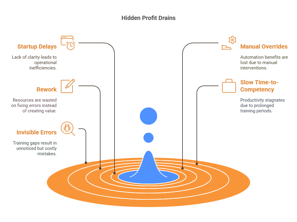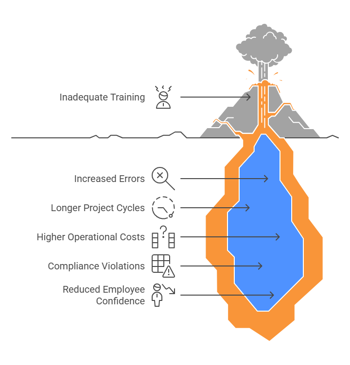 Inadequate training directly leads to increased errors, rework, and operational inefficiencies, all of which carry serious financial consequences. Not properly trained employees are more likely to make mistakes, slow down workflows, and require constant corrective actions. Over time, these issues drive operational costs through wasted materials, extended project timelines, and poor-quality outputs. Additionally, frequent errors can cause customer dissatisfaction, compliance failures, and even damage to high-value assets. Rather than being a minor inconvenience, the cumulative impact of poor training quietly drains profitability, making it a hidden but critical threat to the organization’s long-term success.